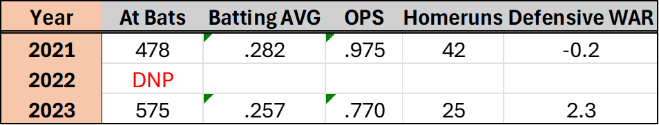 In 2023 Tatis’ hitting dropped significantly. He managed to only hit 25 homeruns despite playing ten more games additionally his batting average, OBP and OPS all dropped considerably. Fernando managed to still be an elite hitter, but he hasn’t been the same since his PED suspension.